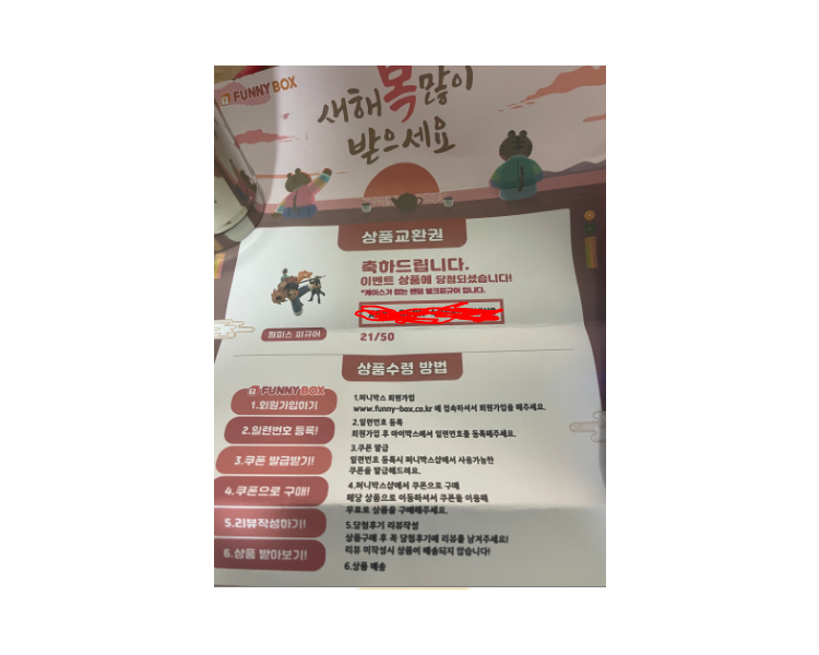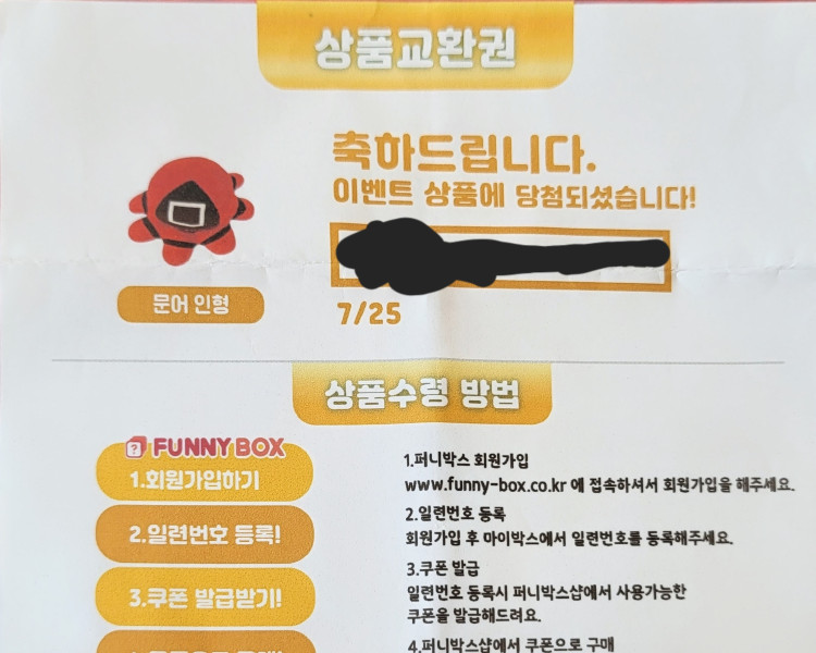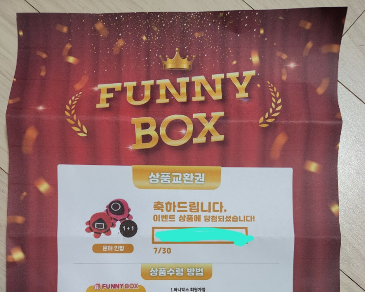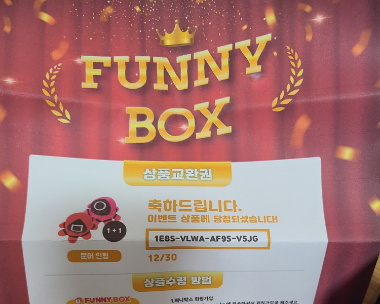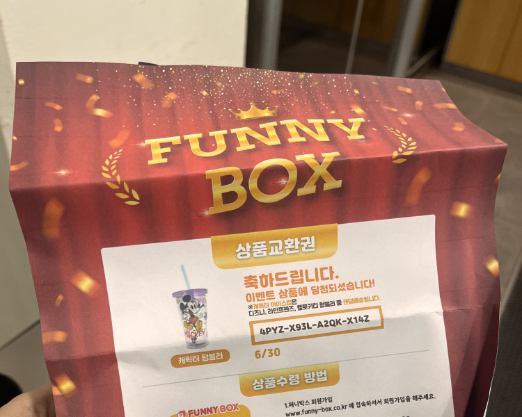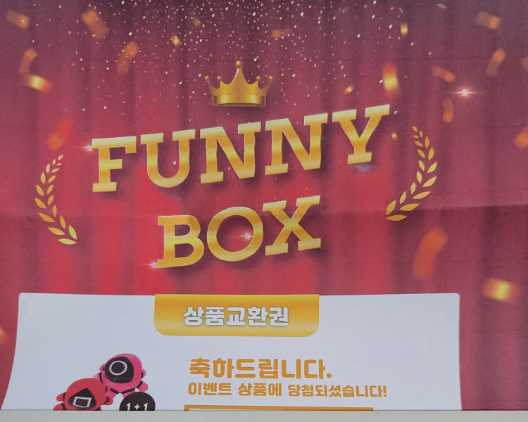 전시회 다녀오다가 근처 "FUNNY BOX"가 있길래, 지인이 선물이라고 2개 구매해 하나를 선물 받았는데 당첨되었네..