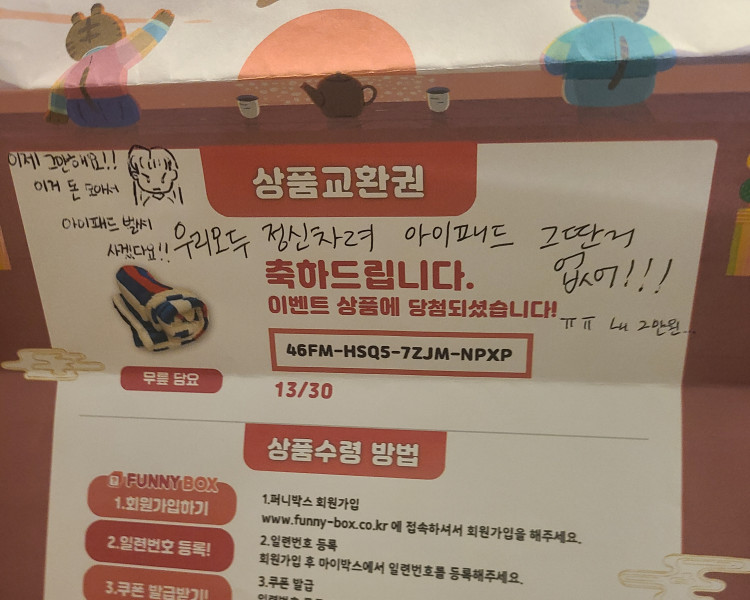 퍼니박스 당첨 후기 게시판입니다. 당첨후기 게시판은 퍼니박스를 이용한 사진을 1장이상 첨부 부탁드립니다.