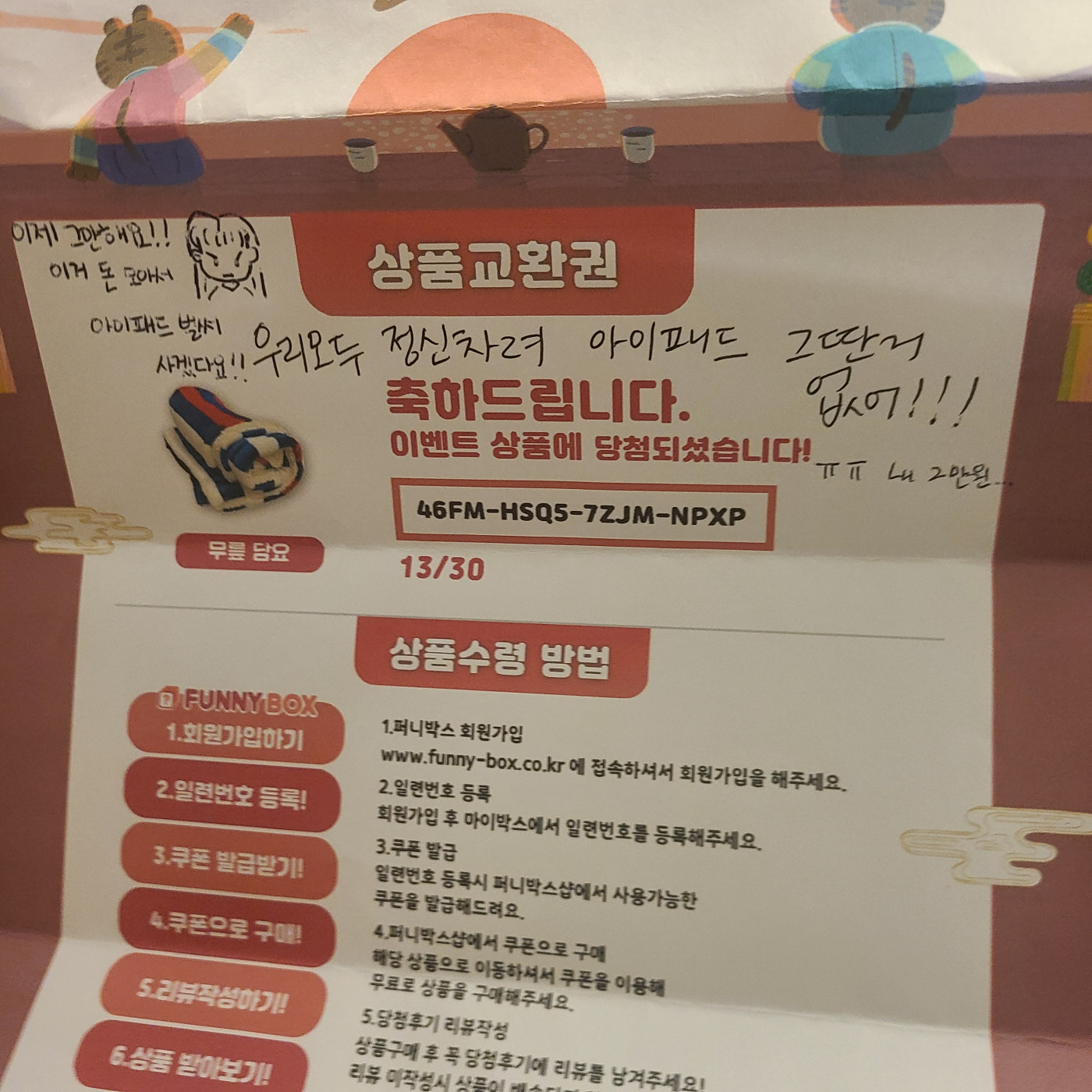 ㅎㅎ 담요 페이지 정보 본문 아이패드를 간절히 바랬으나 담요라니 ㅎㅎㅎㅎㅎ쥬륵 친규들이 엄청 놀리네욤... 이전글구매후기 22.03.15 다음글퍼니박스 당첨후기~ 22.03.06 목록 댓글 0 댓글목록 등록된 댓글이 없습니다.